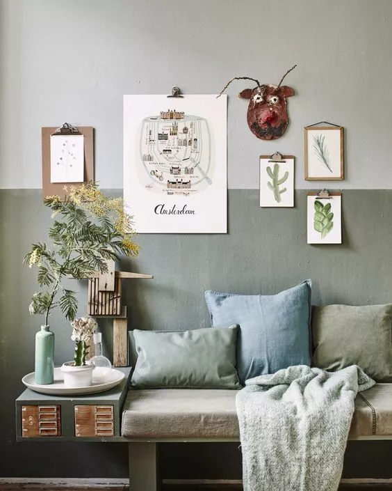 怎么做到的呢?比如下面這張圖中,鼠尾草綠灰的墻面好像變成了沙發的靠背,同時又如空間的畫框一般把人的目光吸引過來。