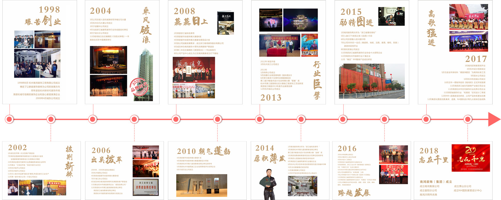 浙江南鴻裝飾股份有限公司成立于1998年,前身為杭州南鴻裝飾工程有限公司,為浙江省著名商標、知名商號企業。南鴻已發展成為一個擁有31個直屬裝飾分公司和集產品、櫥柜、軟裝、定制、空暖、集采六大板塊的大型裝飾企業,裝修業務遍及浙江省內外。總業務體量到已經達到8個億,歷年來,公司獲得了全國、浙江省、杭州市等授予的近百項榮譽。南鴻人始終秉承“做裝修,交朋友”的核心思想,正直、謙遜、寬容、樂觀、堅持的經營服務理念,為廣大客戶打造高品質家居生活而努力,在十多年的家裝浪潮中實現了管理和產品雙升級,并成為浙江省管理型的家裝企業中的翹楚。樹有根,水有源,所以感恩時代,奉獻社會,將是南鴻的一貫品格和永遠的追求。